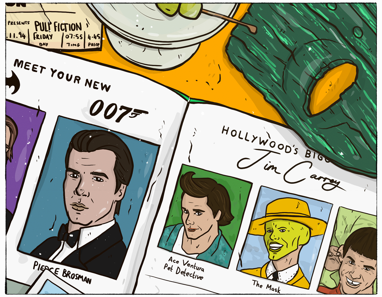 1994 illustration featuring films like The Lion King, Speed, The Mask, Ace Ventura, Pulp Fiction, and the announcements of Val Kilmer as Batman and Pierce Brosnan as James Bond 007.